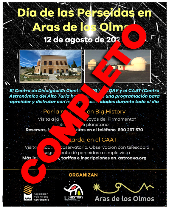 El Centro de Divulgación Científica Big History y la Asociación Valenciana de Astronomía (AVA) han preparado una programación para aprender y disfrutar del cielo nocturno y, especialmente, de la lluvia de estrellas de las Perseidas, con múltiples actividades a lo largo de la jornada del 12 de agosto.