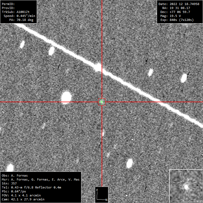 Este cometa se desplazaba lentamente por el sensor debido principalmente a que está a más de 2 unidades astronómicas de distancia. Gracias a esto se han podido hacer exposiciones de 120 segundos permitiendo alcanzar una buena relación señal/ruido. La magnitud era de 19.5 así que obtener 3 observaciones se ha necesitado casi 1 hora de exposición.