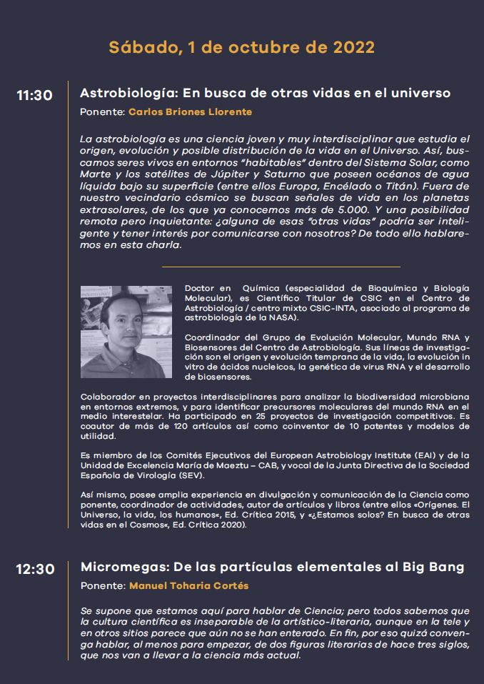 Las conferencias van a durar 2 días y son francamente interesantes ya que acercan al ciudadano conceptos tan punteros como las ondas gravitacionales, la astrobiología, cómo combatir la gran contaminación lumínica que nos niega un cielo estrellado a todas las personas, etc.