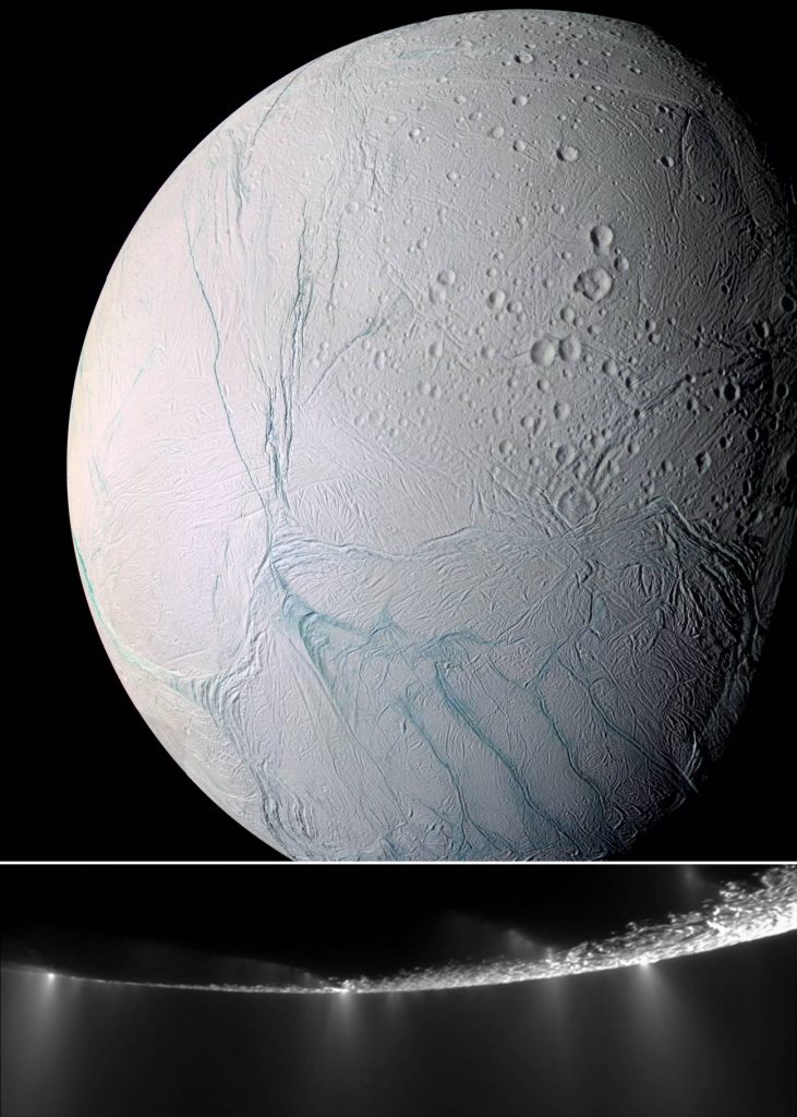 En 2005, la misión Cassini recogió imágenes de los penachos de vapor de agua, géiseres y fumarolas que expulsan vapor de agua desde su océano.