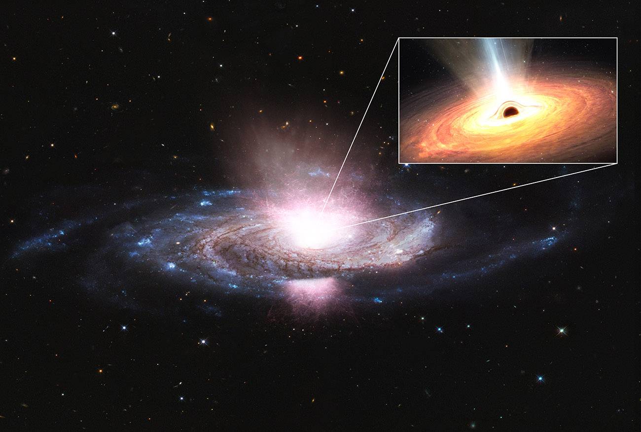 En el corazón de toda gran galaxia hay un agujero negro supermasivo, cuya inmensa gravedad atrae el gas de su entorno. A medida que el gas entra en espiral, se acumula en un disco de acreción plano alrededor del agujero, donde se calienta e ilumina. Con el tiempo, el material más cercano al agujero negro sobrepasa el punto de no retorno y es engullido.
