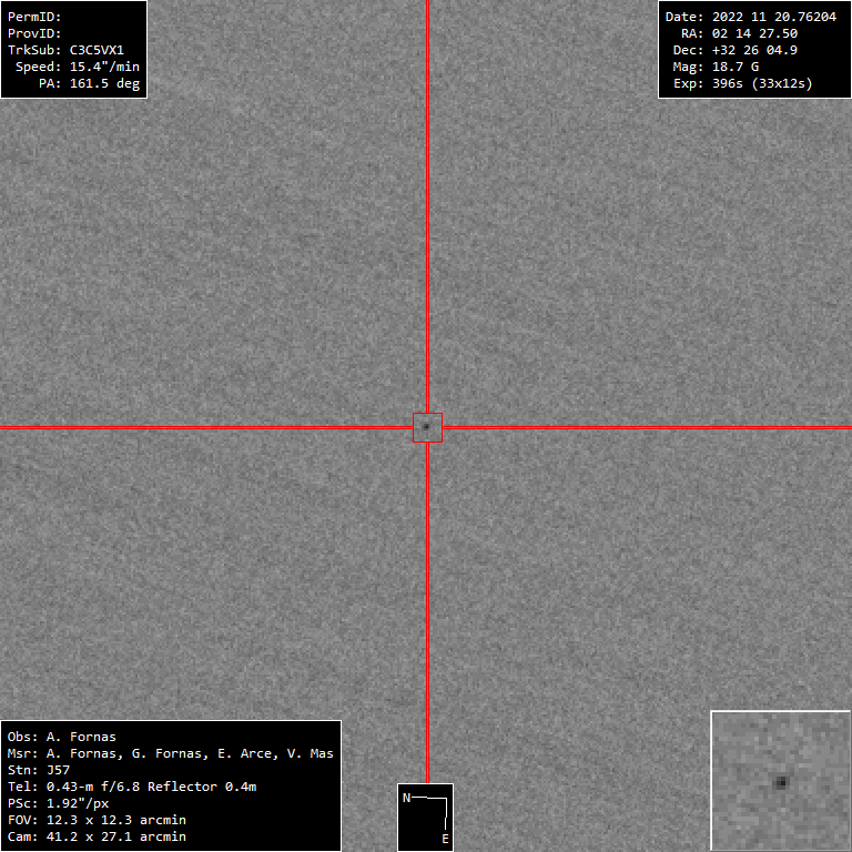 Entre nubes hemos podido capturar este pequeño NEO de 25 metros que pasaba a unos 15″/min y tenía magnitud 19. Fueron necesarias más de 100 tomas de 12 segundos para poder obtener 2 medidas astrométricas de calidad. Habría sido ideal fotografiarlo durante más tiempo pero las nubes no lo permitieron.