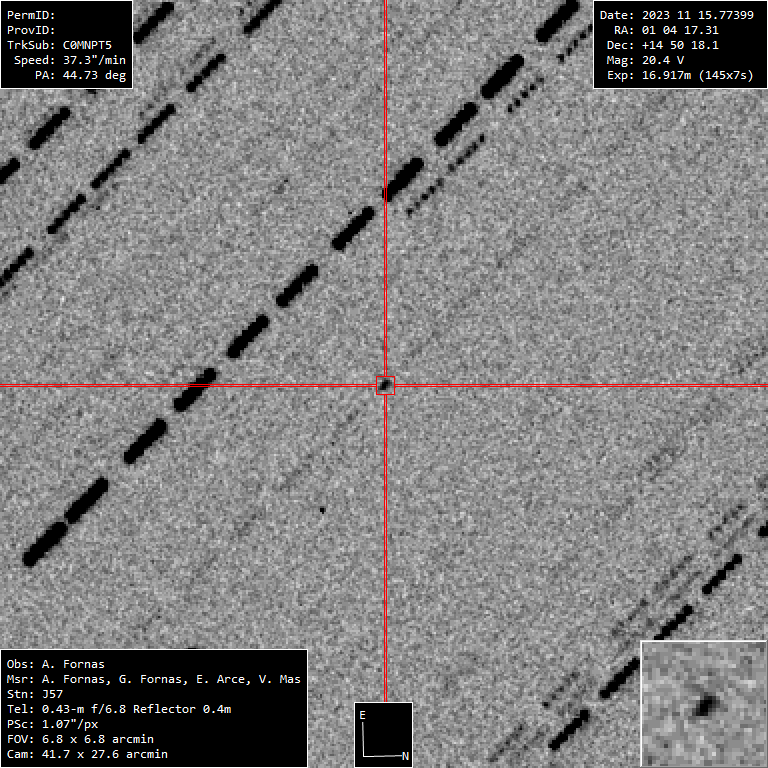 Este NEO pasó bastante cerca de nosotros, pues el 17 de noviembre de 2023 estuvo a una distancia de 3.25 LD (Lunar Distance) de nosotros, lo que en términos astronómicos es muy poca distancia. El tamaño nunca supuso un peligro, pero ser pequeño y pasar cerca lleva inevitablemente a ser débil y correr mucho. Con una magnitud de casi 20 se necesitaron 146 tomas de tan solo 7 segundos para poder obtener 3 observaciones astrométricas.