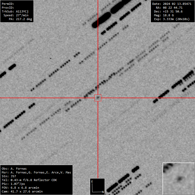Como es grande su magnitud no llega a la 19. Con 50 tomas de 10 segundos se han podido obtener 3 mediciones astrométricas de calidad.