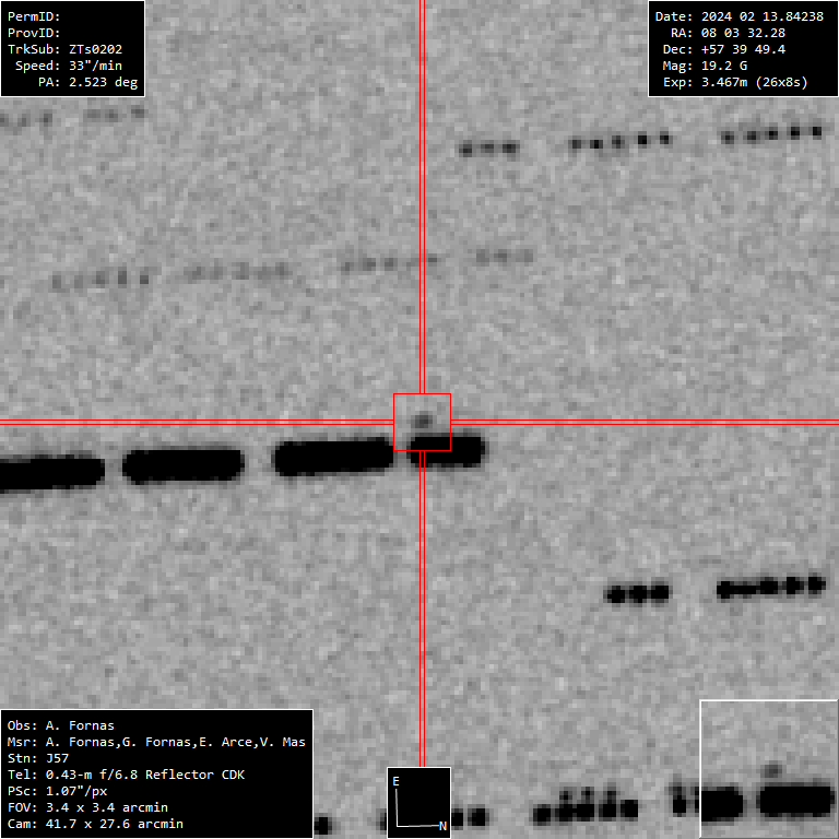 Rápido y brillante, es de agradecer. La magnitud no llega a la 19 y con 55 tomas de 8 segundos hemos podido obtener 3 medidas astrométricas del asteroide.