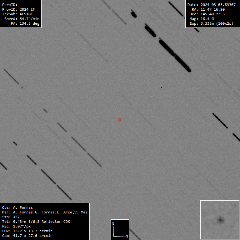 En este caso no buscamos un confirmar la existencia de un asteroide tipo NEO, si no que ya se ha catalogado y la órbita que se calcula pasa MUY cerca de nosotros. Son 5 metros y no es ningún peligro, pero estos objetos merecen especial seguimiento. Como pasan tan cerca, recorren el cielo muy rápido y hubo que hacer 1000 tomas de 2 segundos para capturarlo.