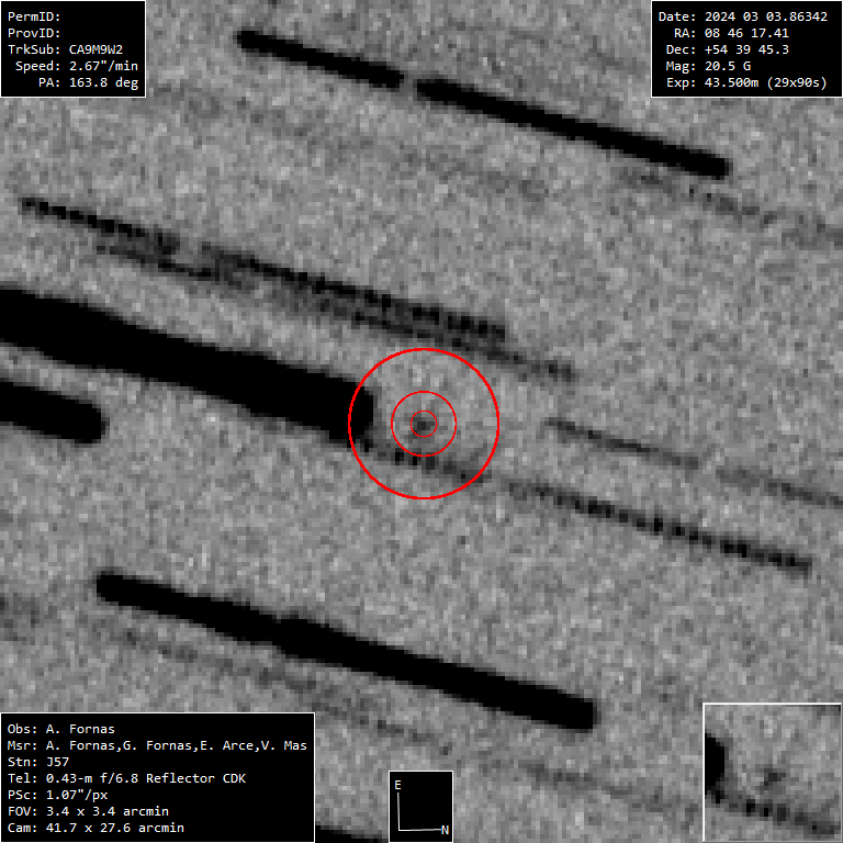 Un asteroide que a pesar de tener 120 metros de diámetro está muy lejos y tiene magnitud 20.5 La noche no era muy buena y se notó a la hora de extraer las observaciones