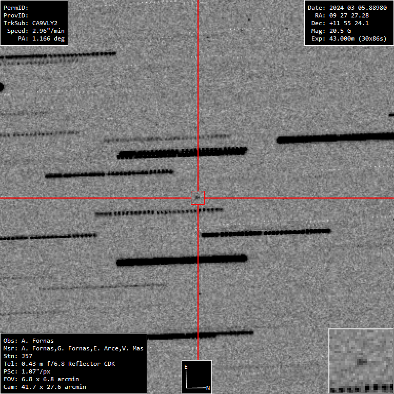 Otro asteroide tenues y difícil de detectar. Con magnitud 20.5 y 30 tomas de 86 segundos sólo se puedo obtener 2 medidas. La razón de no exponer durante más tiempo fue las omnipresentes nubes de marzo.