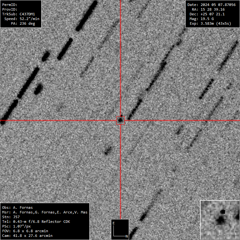 Con 20 metros de diámetro ya es una piedra respetable. Con una magnitud de 19.5 no se puede decir que sea muy débil, pero iba rápido. Se necesitaron 43 tomas de 5 segundos para obtener 3 medidas.