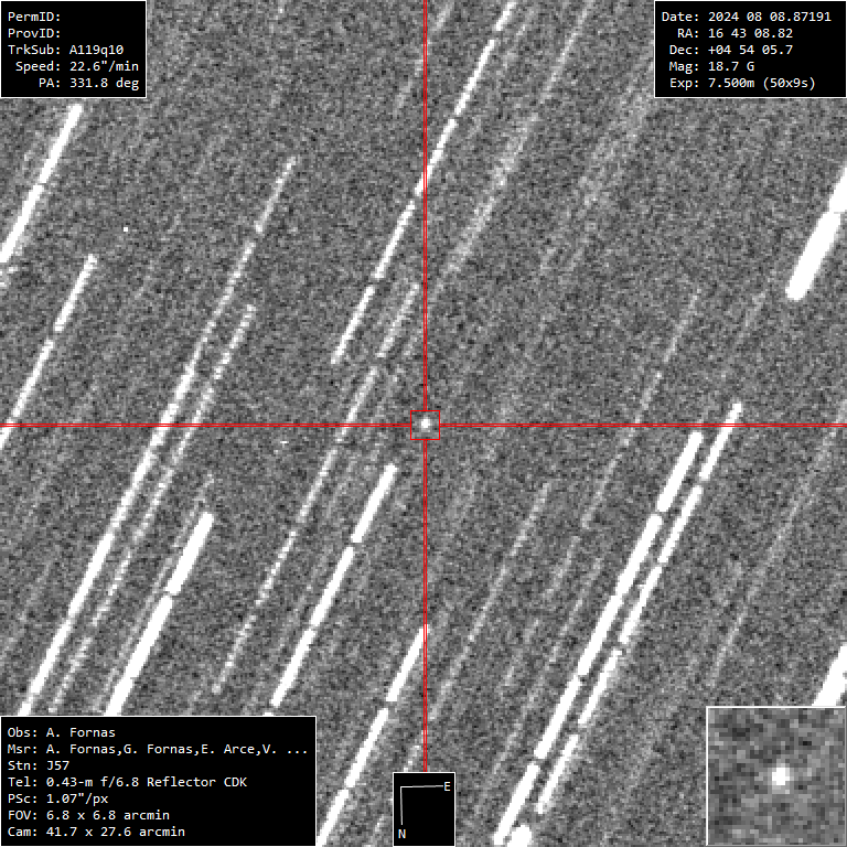 A pesar de ser un NEO rápido, es relativamente brillante. Con magnitud 18.5 han bastado 50 tomas de 9 segundos para capturarlo con precisión.
