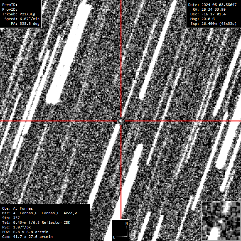 Con una magnitud de 20 y no subiendo mucho en el horizonte, este NEO ha sido difícil. Además pasó por delante de 2 estrellas teniendo que descartar esas tomas. Con 50 tomas de 33 segundos apenas se han obtenido 2 observaciones válidas.
