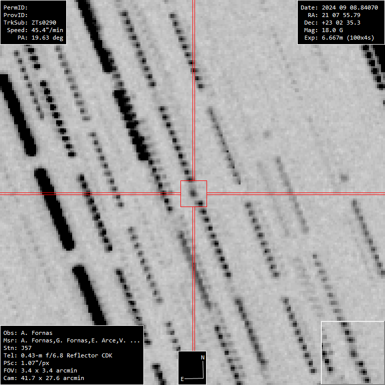 Tras unos días nublados finalmente se ha podido abrir la cúpula y hemos aprovechado para medir más NEOs. Tenía una magnitud 18 por lo que, aunque era brillante, viajaba bastante rápido y pasaba por delante de estrellas lo que dificultó su medición. Hicieron falta 100 tomas de 4 segundos para obtener 3 medidas de calidad.