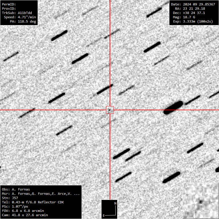 Difícil NEO pues a pesar de pasar lejos se desplazaba muy rápido por el campo y se han necesitado 174 tomas de 2 segundos para capturarlo. Además, las efemérides iniciales del Minor Planet Center estaban desviadas y hemos tenido que repetirlo recentrando en otro punto.