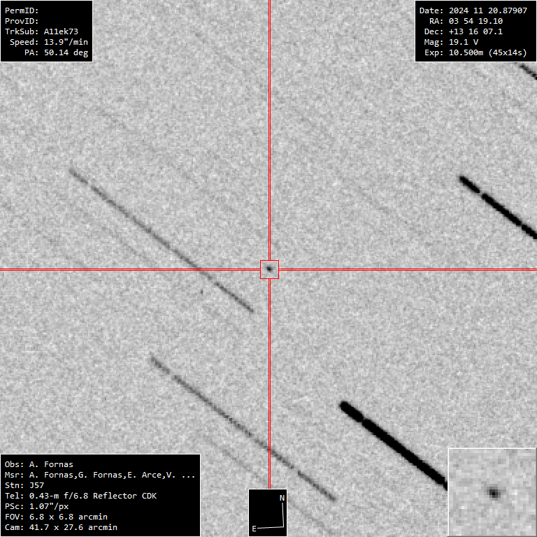Con un tamaño similar al bólido de Cheliábinsk, este NEO no ha supuesto un gran problema. Con magnitud 19 y una velocidad lenta, con 45 tomas de 14 segundos se han podido obtener 3 observaciones.
