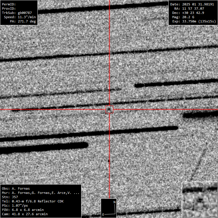 Otro NEO difícil de obtener. Con 136 fotos de 15 segundos tan sólo pudimos obtener 2 observaciones de magnitud 20.5. Este asteroide es bastante grande así que verlo de lejos y débil es una buena noticia.