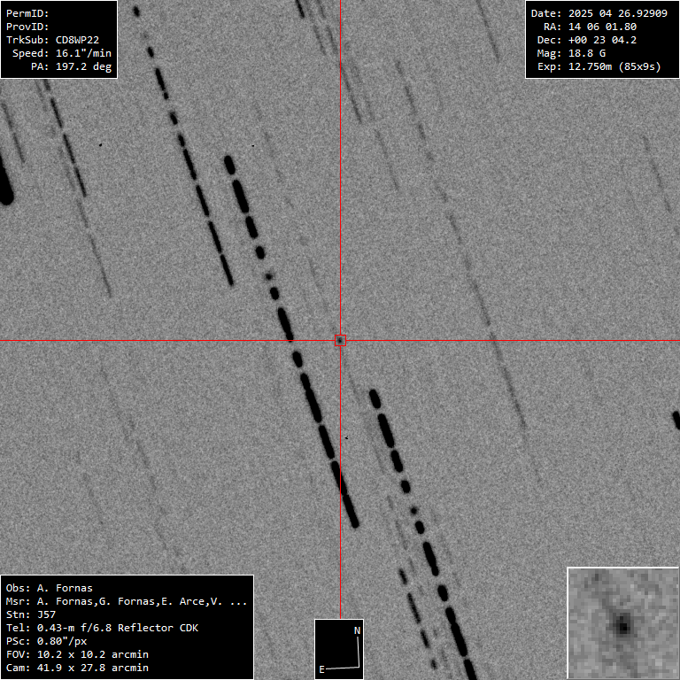 Un NEO anormalmente rápido para lo alejado que se encuentra de nosotros. Se necesitaron 86 tomas de 9 segundos para obtener 3 medidas. La magnitud no era excesivamente alta, en torno a 18.4, y aunque pasaba por encima de una estrella pudo detectarse con claridad.