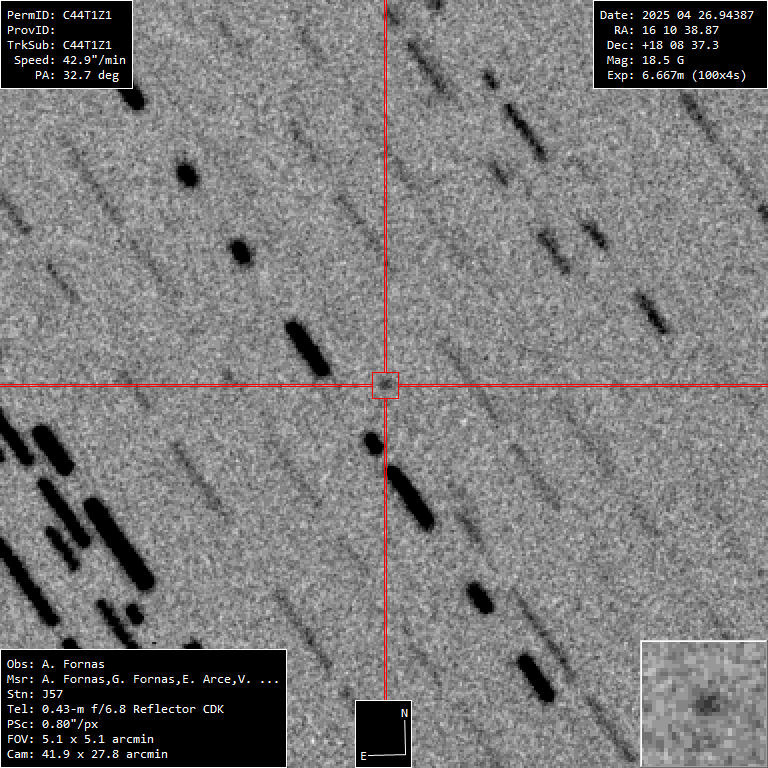 La noche era ventosa y se puede apreciar en la poca nitidez del asteroide. Aunque tenía magnitud 18, iba rápido y hubo que hacer 160 tomas de 4 segundos para obtener 2 observaciones.