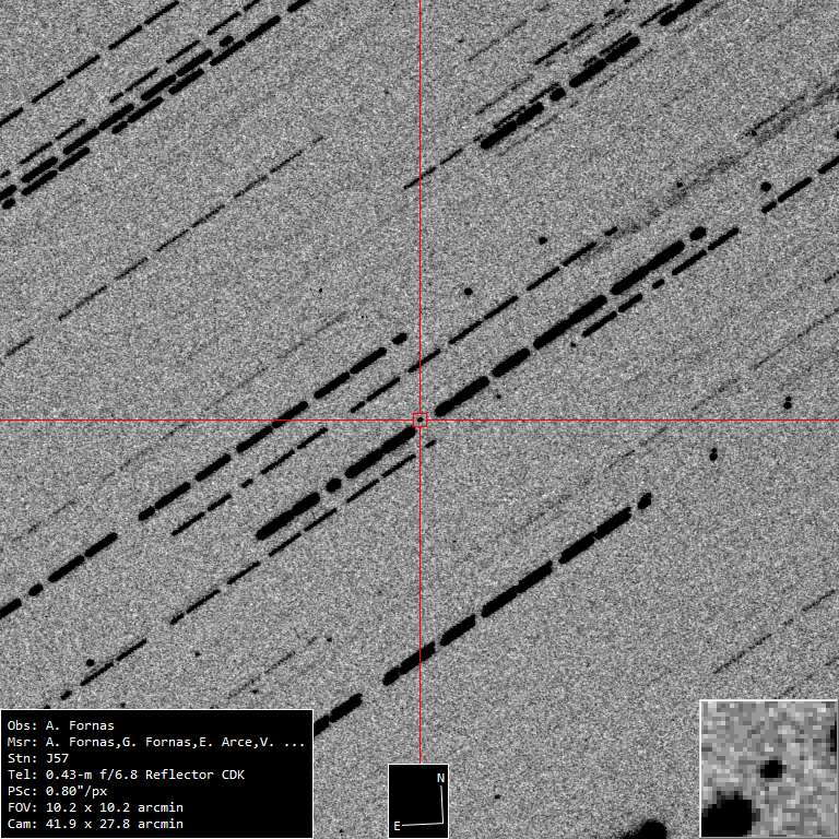 Sorprendentemente claro para tener magnitud de 19.5 y moverse rápido. Con 115 tomas de 9 segundos se han obtenido 3 buenas observaciones.