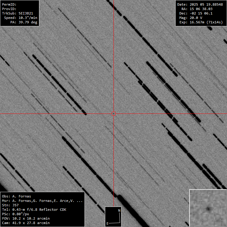 Tenemos un NEO moderadamente grande, que no pasa excesivamente cerca y por tanto no es muy brillante. Con magnitud 20 se han necesitado 75 tomas de 14 segundos para obtener 3 buenas medidas.