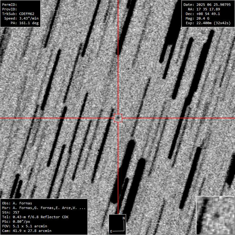A pesar de tener una magnitud de 20.6 su movimiento era relativamente lento por lo que las tomas han podido alargarse a 42 segundos cada una. Con 32 imágenes hemos podido obtener 2 observaciones con residuos inferiores al segundo de arco.