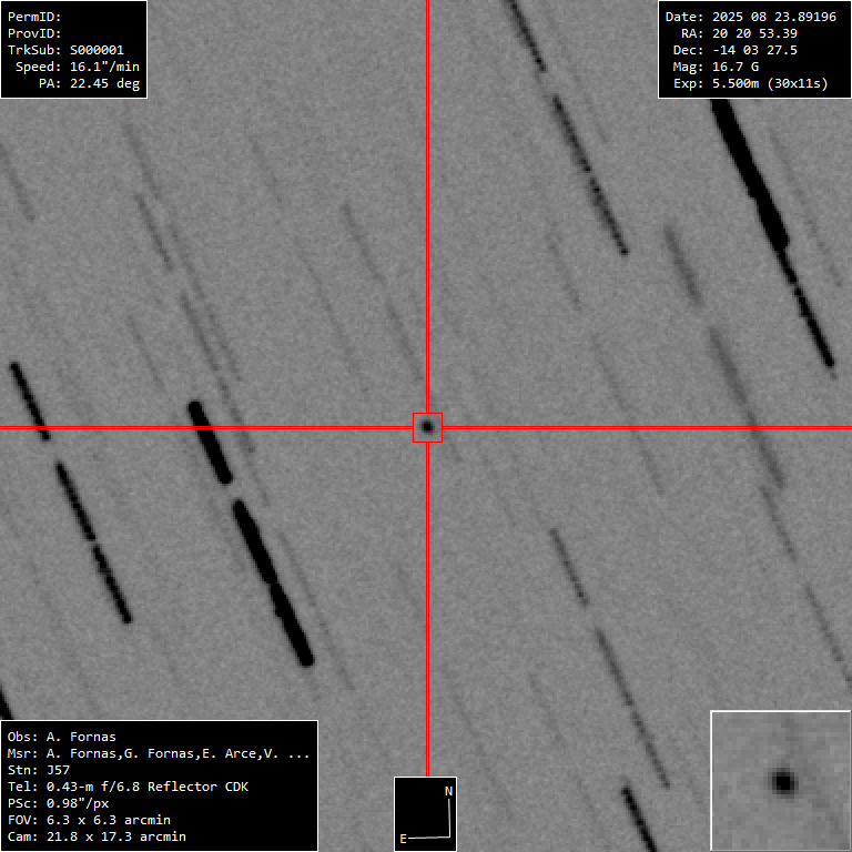 Con magnitud 16.7 es un NEO realmente fácil de detectar. Con 30 tomas de 11 segundos se han obtenido 3 buenas observaciones.