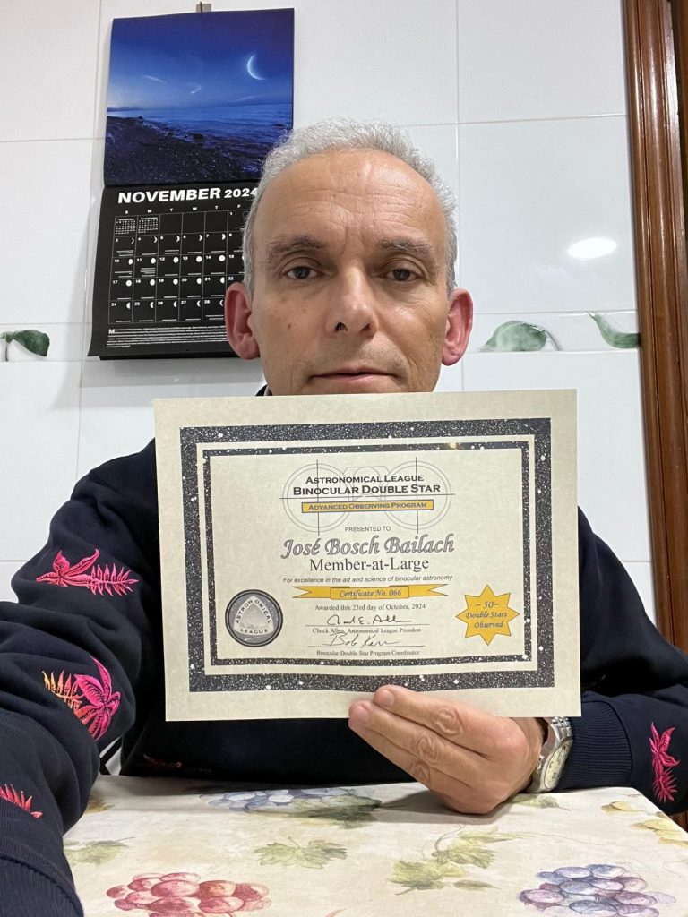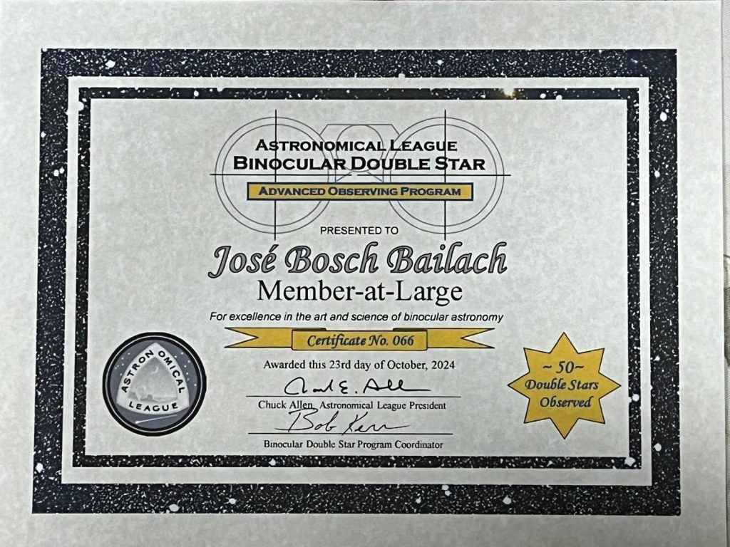 La Astronomical League de Estados Unidos ha premiado a nuestro compañero Pepe Bosch por haber completado el programa avanzado de Observación de Estrellas Dobles con Prismáticos. En su día ya obtuvo sendos reconocimientos por haber completado el programa de Observación de Objetos Mesier con Prismáticos y el Programa de observación de estrellas dobles con binoculares.