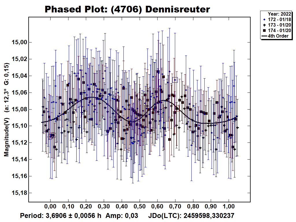 Se hicieron observaciones desde el 18 al 20 de enero de 2022 y se determinó que el periodo de rotación es de 3.69 h con una amplitud de 0.03 magnitudes. Esta variación tan pequeña de la amplitud puso al límite las capacidades de deteccion del equipo. Wazczak encontró u periodo de 2.56 h con datos incompletos.