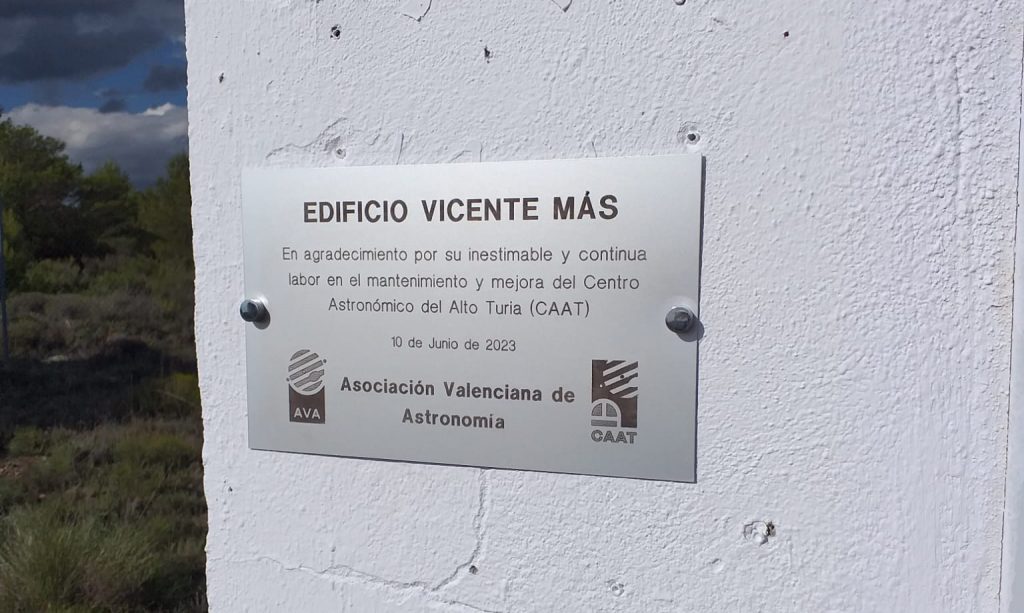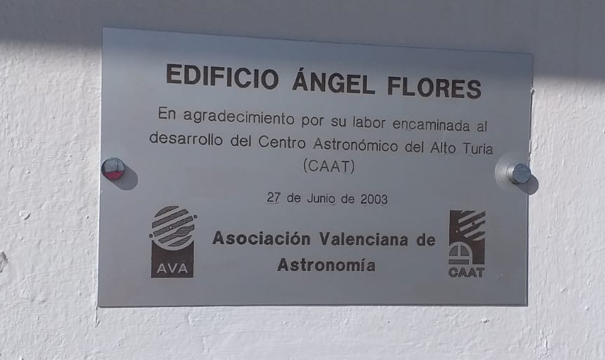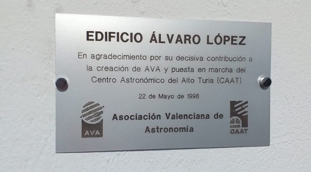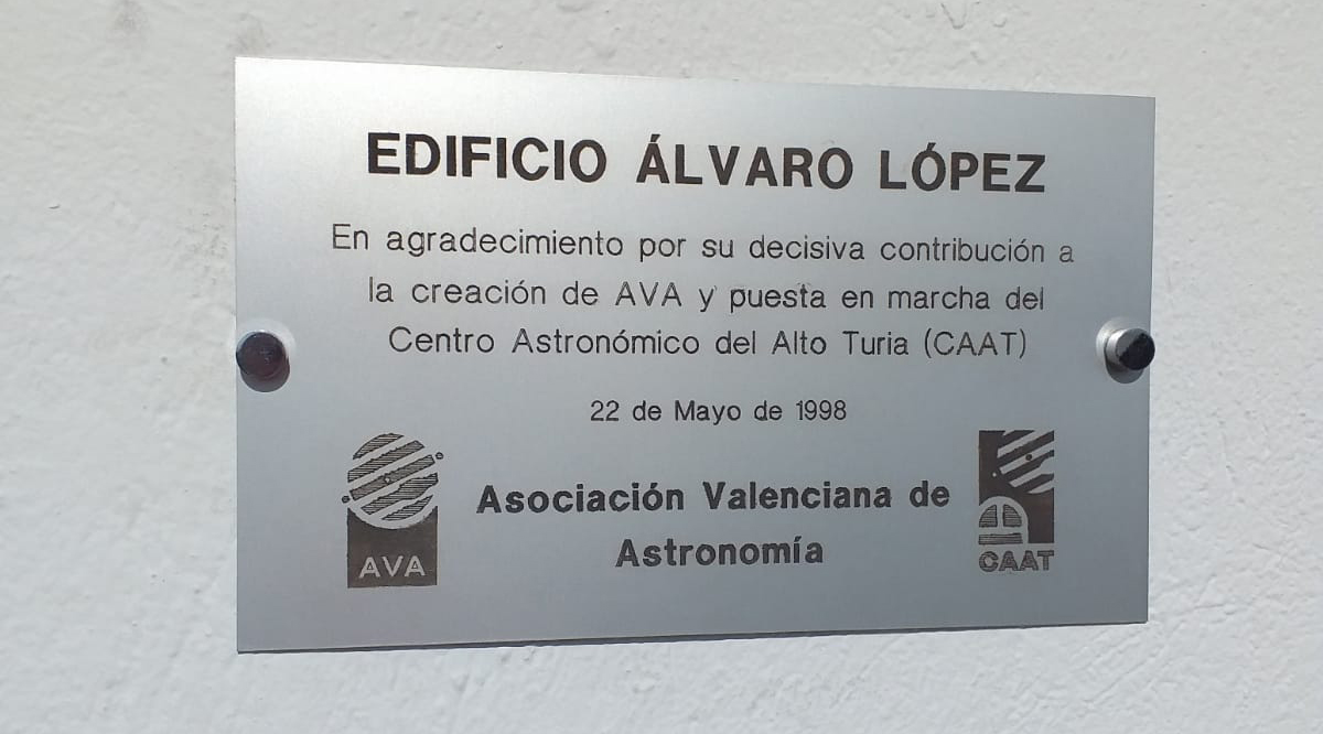 Este sábado 10 de junio, aprovechando la celebración de la Jornada de Puertas Abiertas para conmemorar el 25 aniversario de la inauguración del CAAT y el “bautizo” que se iba a hacer del edificio del Takahashi con el nombre de nuestro compañero Vicente Más, hemos renovado la placa que estaba colocada en el edificio que alberga el telescopio CDK de 17” y que lleva el nombre de Ángel Flores y hemos reparado una injusticia que llevaba 25 años presente en el CAAT: la ausencia de una placa nominativa en el edificio Álvaro López, que alberga el Meade de 16”. Por algún motivo que desconocemos –sin duda un olvido imperdonable-, el primer edificio que se inauguró en el CAAT en mayo de 1998 y que estaba dedicado a quien fuera Director del Observatorio Astronómico de la Universidad de Valencia, D. Álvaro López García, carecía de placa conmemorativa. Alvaro López -fallecido en 2019- fue director del Observatorio Astronómico de la UV desde 1968 hasta el año 2000, además de socio fundador de AVA en 1972. Gracias a su tesón y empeño el Centro Astronómico del Alto Turia pudo convertirse en una realidad, un sueño perseguido por los socios de AVA desde el mismo momento de la gestación de la entidad. Con la instalación de su placa, hemos querido rendirle homenaje en el 25 aniversario de la inauguración de las instalaciones.