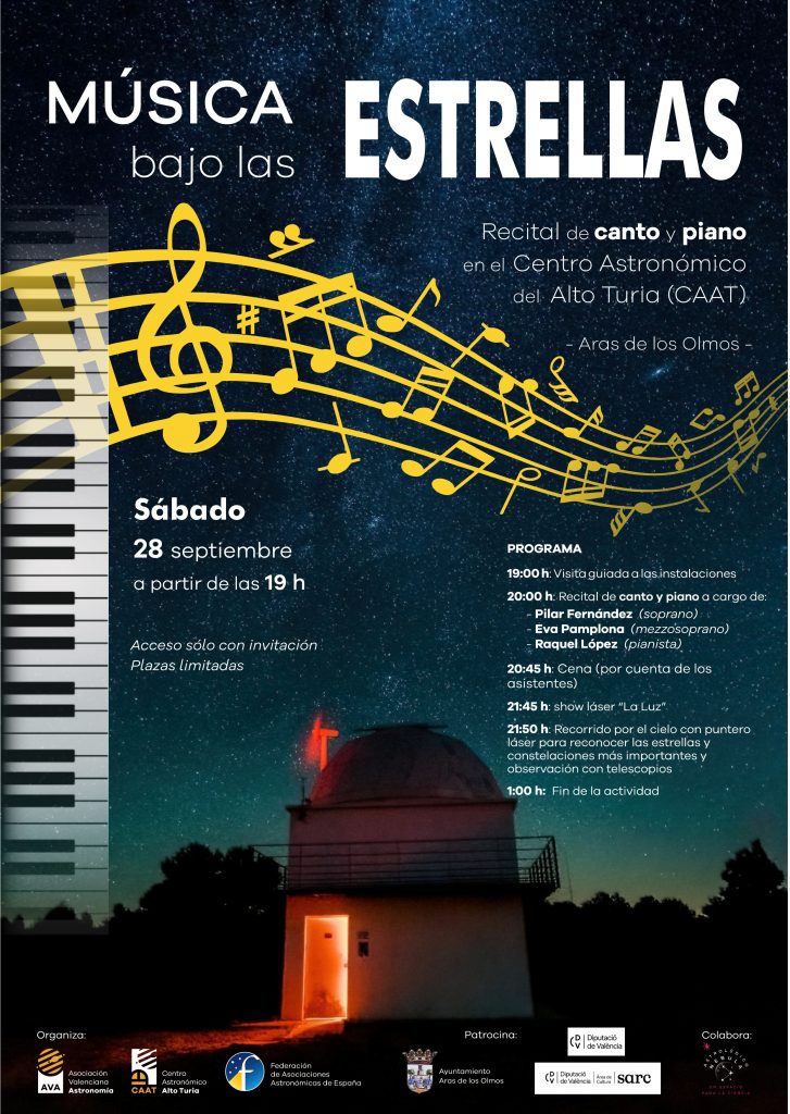 La Asociación Valenciana de Astronomía y el Ayuntamiento de Aras de los Olmos te invitan a disfrutar de un recital de piano y canto lírico bajo las estrellas en el Centro Astronómico del Alto Turia (CAAT, Aras de los Olmos), en uno de los lugares con cielos más oscuros de la Península Ibérica. En el recital participarán tres artistas valencianas profesoras de Conservatorio, que interpretarán las siguientes obras: