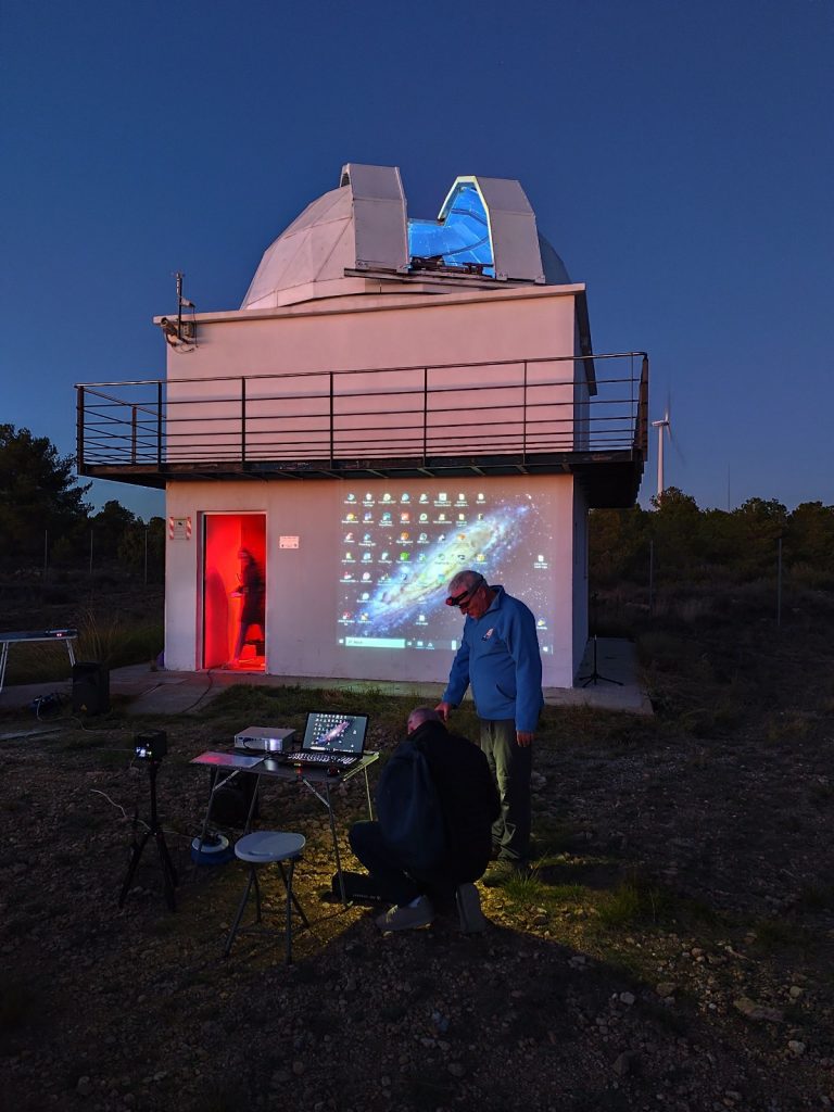 Durante el recital se proyectarán imágenes astronómicas sobre la pared de uno de los edificios. A las 20:45 h será el momento de la cena (por cuenta de los asistentes). Posteriormente, sobre las 21:45 h, se proyectará un show láser de unos 5 minutos de duración ofrecido por gentileza de la empresa Nébula-Astrolúdico. Y al terminar, hacia las 21:50 h, comenzará la observación astronómica con un recorrido por el cielo nocturno mediante puntero láser para aprender a reconocer las principales estrellas y constelaciones de esta época del año, seguido de una observación con potentes telescopios hasta la 1:00 h de la madrugada, aproximadamente, en la que observaremos cúmulos, nebulosas, galaxias, estrellas dobles, planetas, etc.