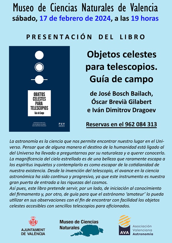 Este próximo sábado 17 de febrero a las 19 h tendrá lugar la presentación oficial del libro «Objetos celestes para telescopios. Guía de campo» escrito por nuestro compañero Pepe Bosch, y que complementa a la excelente guía -también elaborada por él-titulada «Objetos celestes para prismáticos», que tanto éxito está cosechando a nivel mundial. El evento tendrá lugar en el Museo de Ciencias Naturales de Valencia, situado dentro del jardín de Viveros.