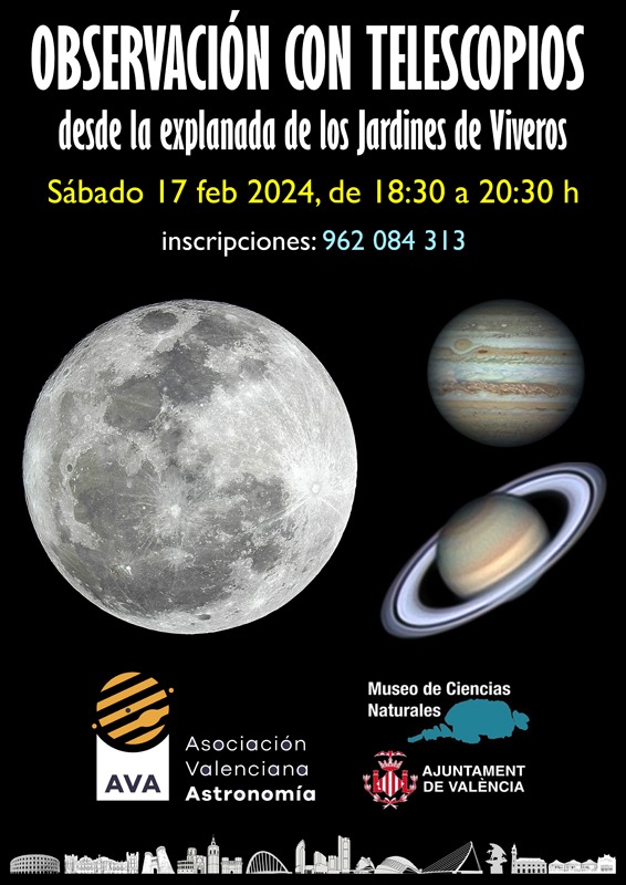 El Museo de Ciencias Naturales de Valencia, situado dentro del jardín de Viveros, ha organizado para este próximo sábado 17 de febrero, de 18:30 a 20:30 h, una observación con telescopios en la que apuntaremos a la Luna creciente y Júpiter.