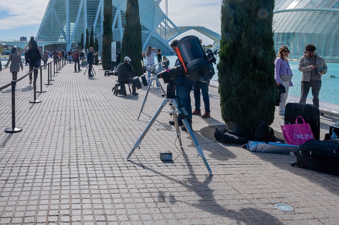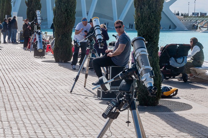 El evento, que congregó a aficionados y curiosos del cosmos de todas las edades, se llevó a cabo desde el Paseo de los Cipreses, junto al Hemisfèric y frente al Museo de las Ciencias. AVA contribuyó aportando una docena de telescopios equipados con filtros especializados para observar tanto la luz visible del sol como la luz de la línea espectral H-alfa, además de un telescopio para proyección en pantalla blanca, que permitió disfrutar de detalles fascinantes tanto de la fotosfera como de la cromosfera solar. El evento estuvo cuidadosamente planeado para garantizar la seguridad de los asistentes. Además de los monitores encargados del manejo de cada uno de los telescopios, también participaron una decena de voluntarios y voluntarias de AVA, que ayudaron a los asistentes a aprovechar al máximo la experiencia, guiándolos en la observación del Sol de manera segura.