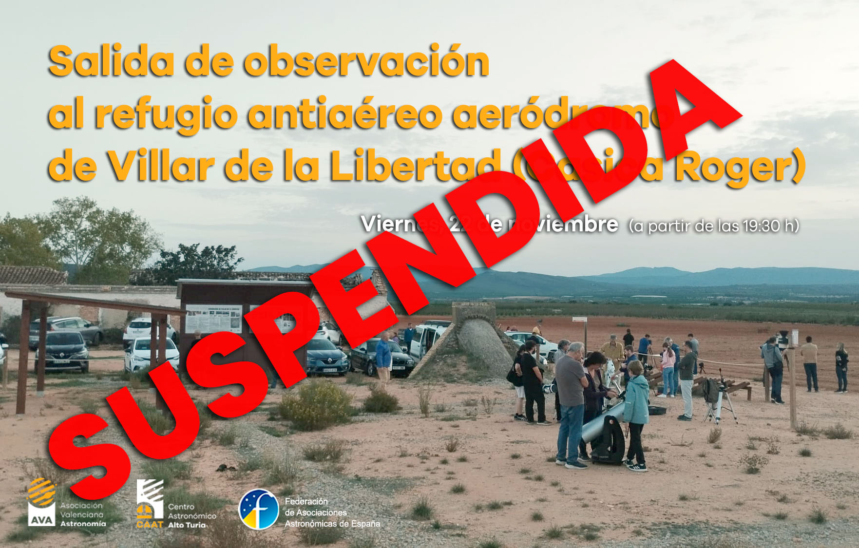 Este próximo viernes tenemos intención de realizar una salida de observación itinerante. En esta ocasión queremos trasladarnos a un lugar en el que estuvimos hace poco para fotografiar el cometa C/2023 A3 (Tsuchinshan–ATLAS): un refugio antiaéreo y aeródromo situado en el término municipal de Villar del Arzobispo llamado Villar de la Libertad (Casico Roger) (https://maps.app.goo.gl/omax93ehQRCbMWcv5). Es un lugar muy amplio, con mucho espacio para dejar los coches y un explanada enorme para montar los equipos. Las condiciones del cielo y de oscuridad parece que son incluso algo mejores que en Casinos Planitia, nuestro otro lugar habitual de observación por esa zona. La Luna saldrá a partir de las 00:18 h, lo cual nos da un amplio margen de tiempo para observar a placer y disfrutar del cielo otoñal (si el tiempo no lo impide, claro).