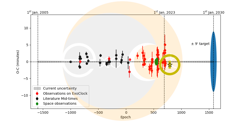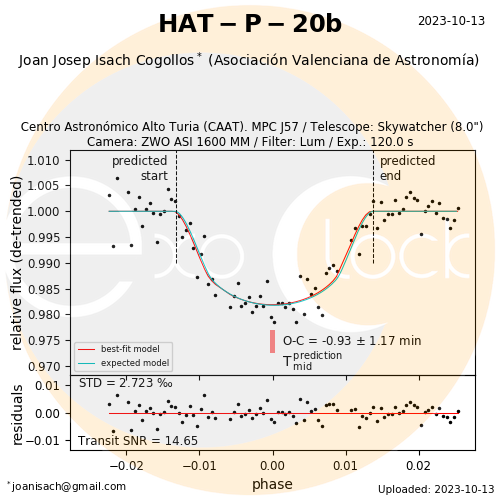Este exoplaneta estaba marcado como prioridad baja, detectable por telescopios con aperturas 5″ en adelante. El O-C (diferencia entre la hora del tránsito observada y la calculada) es bajo, de tan solo 1 minuto.