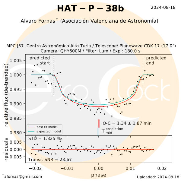 Hemos medido un tránsito del exoplaneta HAT-P-38b en el momento predicho por el ExoClock. Este es el primer tránsito que se procesa íntegramente en AstroImageJ