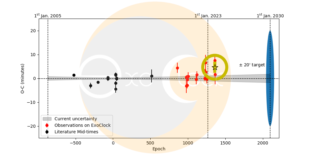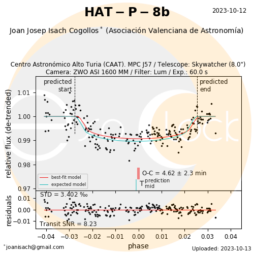 Este exoplaneta estaba marcado como prioridad media, no tenia medidas desde casi hacia 1 año, detectable por telescopios con aperturas 5″ en adelante. El O-C (diferencia entre la hora del tránsito observada y la calculada) es un poco más alto de lo que nos gustaría, de 4.62 ± 2.3 minutos.