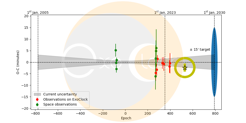 La diferencia O-C es baja, de -2.35 minutos que concuerda bastante con las medidas existentes, aunque para este exoplaneta no son muchas.
