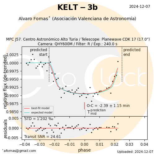 Este tránsito tenía asignada una prioridad Low y como tiene una magnitud de 9, es muy brillante y se usó el filtro R. A pesar de tener una profundidad de 10mmag, ha salido sorprendentemente bien