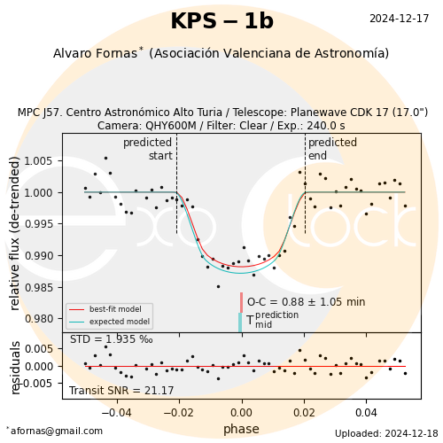 Hemos medido un tránsito del exoplaneta KPS-1b en el momento predicho por el ExoClock. Este tránsito se ha procesado íntegramente en AstroImageJ y se ha utilizado la característica de detrending por cambio de meridiano, es decir, se corrige el escalón que se produce en la fotometría cuando el telescopio gira 180º.