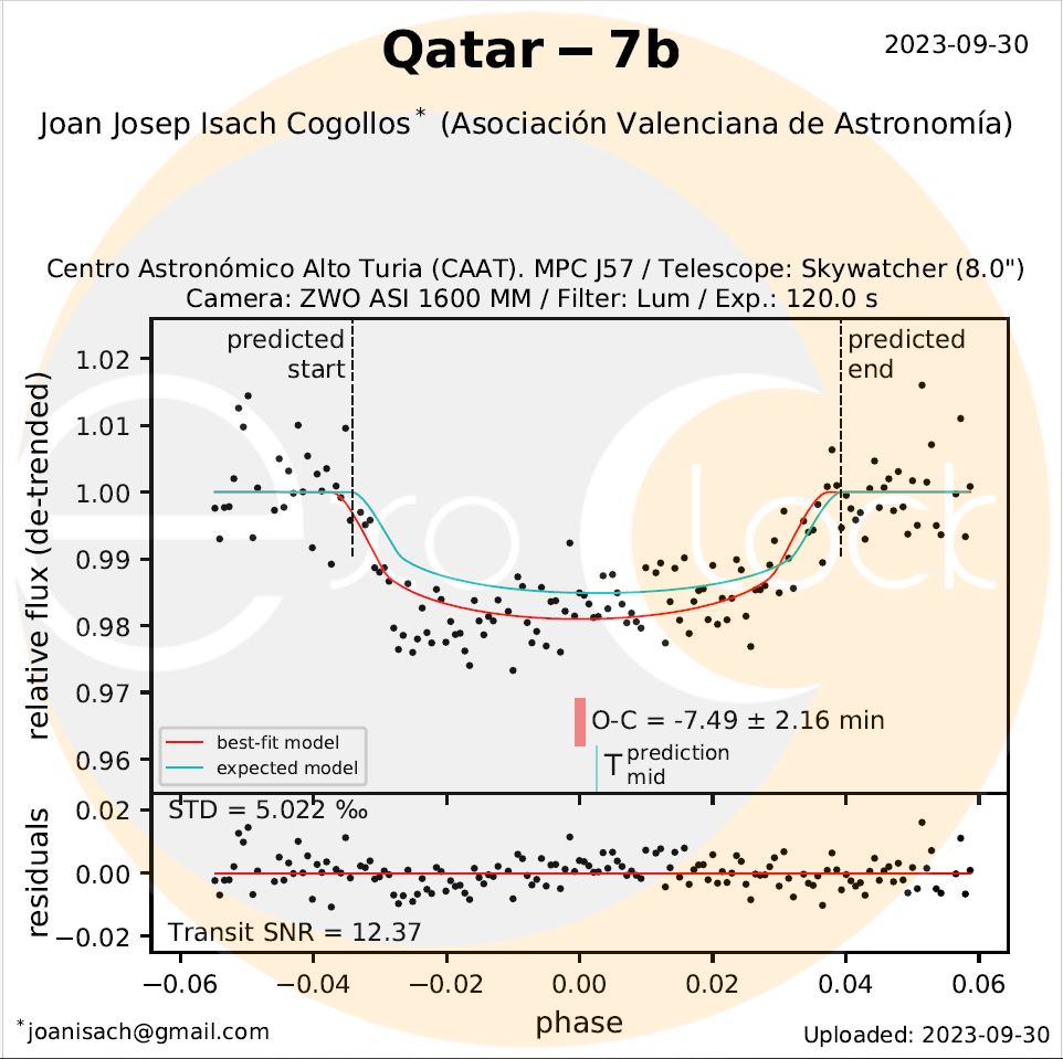Operando en remoto el telescopio Newton desde el CAAT, se ha registrado un tránsito del exoplaneta Qatar-7b en el momento predicho por el ExoClock . El proyecto se encarga de verificar la validez y/o precisión de las efemérides de tránsitos planetarios. Estas efemérides se usarán más adelante para programar lo tiempos de observación del satélite de la misión Ariel.