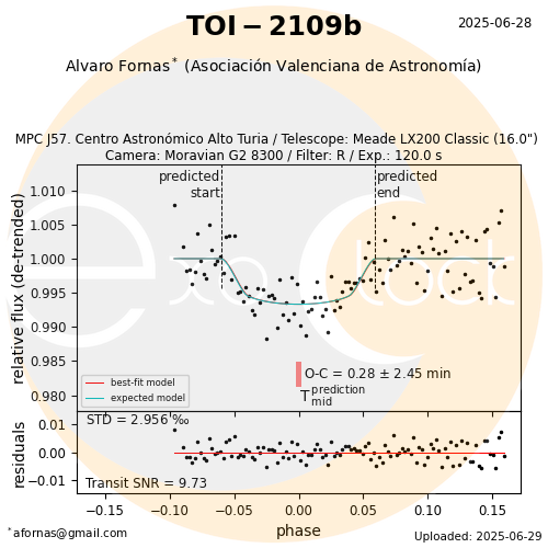 Hemos medido un tránsito del exoplaneta TOI-2109b en el momento predicho por el ExoClock. Este tránsito se ha procesado íntegramente en AstroImageJ no aplicando ningún detrending y dejando que se ala propia Exoclock la que lo aplique.