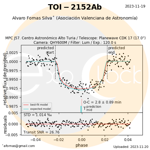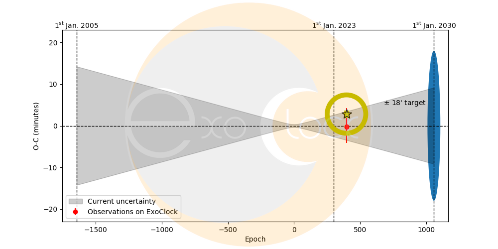 El O-C (diferencia entre tiempos observados y calculados) es bastante bajo, de tan solo 2.8 minutos. Nuestras observaciones encajan con las predicciones existentes tanto en el tiempo como en la profundidad del tránsito. En el siguiente gráfico se puede ver marcada la actual incertidumbre y nuestra medición, que queda dentro del margen de error aceptado. Si las observaciones de diferentes observatorios mostrasen una desviación consistente en las predicciones, Exoclock revisaría las predicciones y el por qué de la desviación.