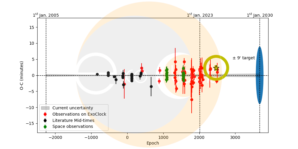 La diferencia O-C de 2.31 minutos respecto a la predicción del tránsito, que es un valor muy bueno. La noche debió de ser buena.