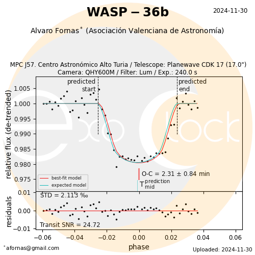 Hemos medido un tránsito del exoplaneta WASP-36b en el momento predicho por el ExoClock. Este tránsito se ha procesado íntegramente en AstroImageJ y se ha utilizado la característica de detrending por cambio de meridiano, es decir, se corrige el escalón que se produce en la fotometría cuando el telescopio gira 180º.