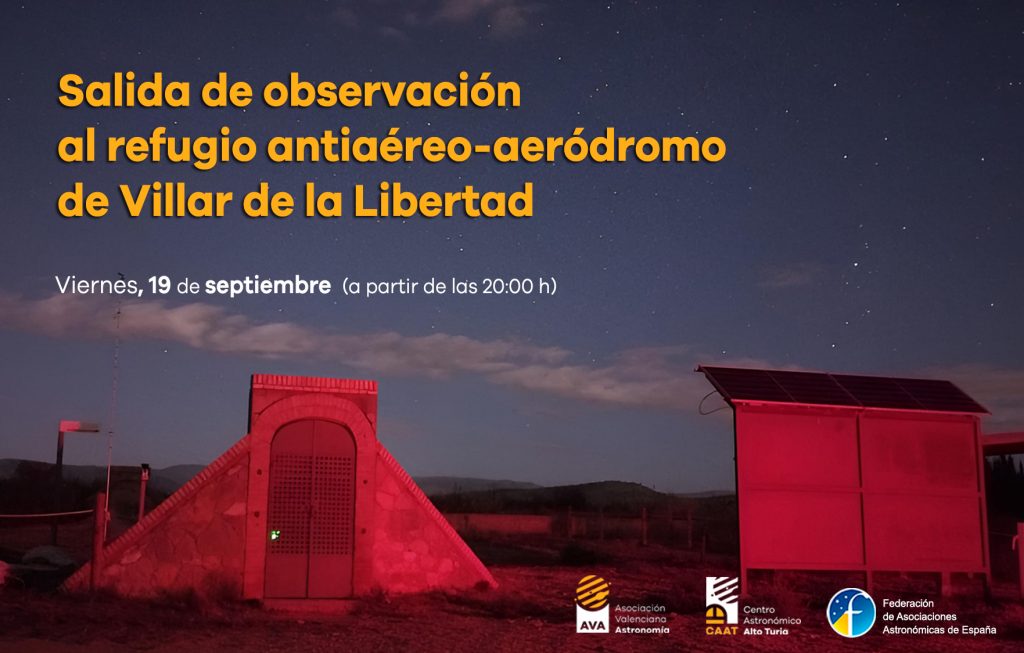 Este próximo viernes 19 de septiembre, vamos a desplazarnos de nuevo hasta Villar del Arzobispo, concretamente al lugar ya que se ha convertido en nuestro preferido para las salidas itinerantes: el aeródromo y refugio antiaéreo de Villar de la Libertad (Casica Roger). Proponemos quedar sobre las 20 h, montaremos y cenaremos. No hay una hora de finalización fijada: cada uno puede volver a su casa cuando lo desee. Si el tiempo acompaña, seguramente algunos se queden hasta bien entrada la madrugada.
