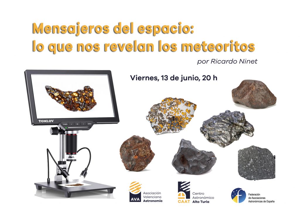 Como recordaréis, el pasado 15 de noviembre nuestro compañero Ricardo Ninet se dispuso a hablarnos del fascinante mundo de los meteoritos, pero por desgracia, la charla sufrió varios contratiempos y no se pudo desarrollar ni grabar adecuadamente. Por eso le hemos pedido que vuelva otra vez al local y nos la repita, pero esta vez lo tendremos todo a punto para que no haya ninguna incidencia. Cruzaremos los dedos.