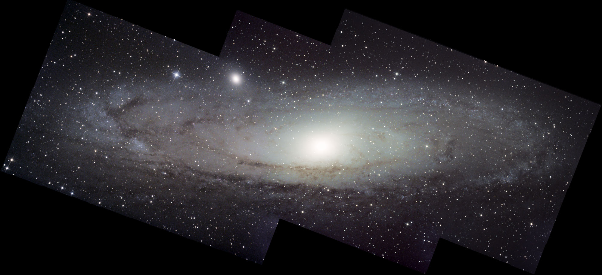 Para Andrómeda he tenido que componer un mosaico de tres fotos porque no cabe entera en el campo de la cámara. Tiene 2 tomas de 6 minutos en cada foto, salvo el lado derecho que tiene además otra toma adicional de 11 minutos.